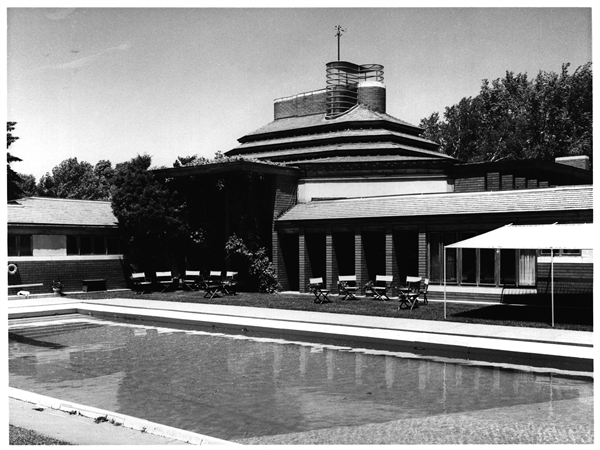 HERBERT F. JOHNSON HOUSE 33 E. Mile Road, Wind Point, Racine County Architect: Frank Lloyd Wright Date of Construction: 1936 Set in a 30-acre wooded ravine with a series of ponds and lagoons, the Herbert F. Johnson house is the largest and most dramatic of Frank Lloyd Wright's Prairie School inspired homes. Built in 1936, for Herbert Fisk Johnson, President of the Johnson's Wax Company, the house displays what Wright called the "eloquence of materials," beautifully finished materials of wood, concrete, and brick. The house seems to grow naturally from the rolling grassy slopes and shallow ravines. The plantings of evergreens and other trees specified by Frank Lloyd Wright in 1938 have now matured to create a harmonious balance with the architecture. Wright designed this 14,000 square foot building as a "wigwam" featuring a fire in the center and a hole in the top to let the smoke out. The house radiates outward from this central fireplace core into four separated wings that Wright termed "zoned" areas of living. In the design for "Wingspread," as the house was known, Wright departed from his previous houses and fitted each wing with separate uses- living quarters in the center, the masters' rooms in one wing, a children's wing, services in the third, and guest rooms and garage in the fourth. Exterior walls are formed from the same red brick found on the interior, pierced by cantilevers and balconies of lap siding cut from California cypress, a wood also used in the pergolas. A number of interior walls are finished in Frank Lloyd Wright's famous "Cherokee red," partnered with slightly concave brick, and rough plaster. The wood on the interior of the building, including several expanses of paneling, is American Oak. The 30 foot high chimney tower rising front and center of the Johnson house includes five fireplaces. Three bands of glass skylights encircle this chimney as part of roof that adorns the wigwam shaped central portion of the residence. The Johnson family lived at Wingspread for over 20 years before presenting it to the Johnson Foundation in 1960. Wingspread is still used today, but as an important educational and cultural conference center. Wingspread is a private property and is open to the public by prearranged tour.