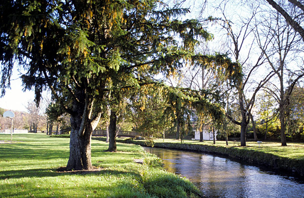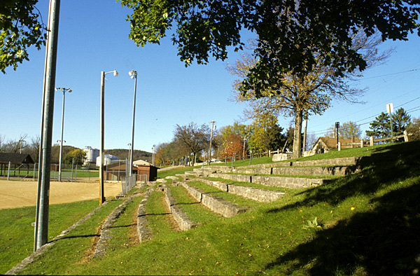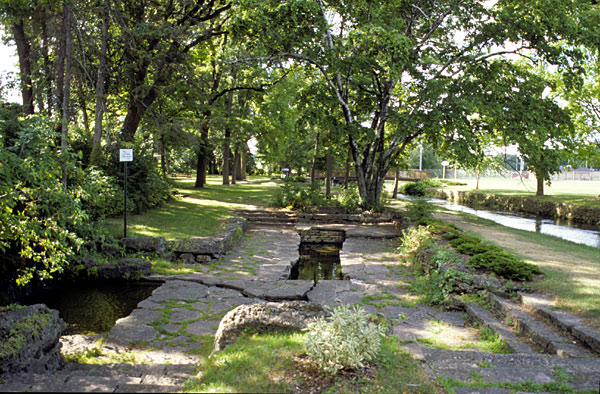 | Goeres Park Fair Street, Lodi, Columbia County Landscape architect: Franz Aust Construction dates: 1935-1961 In 1935, the village of Lodi purchased twenty acres of marsh and pastureland at the north end of the village for a new municipal water treatment plant and a new multi-use park. Franz A. Aust, a University of Wisconsin professor of landscape architecture well known for his advocacy of naturalistic landscaping and for his use of native planting materials, planned the park project. WPA work-relief funds were used to build the park. Because Spring Creek divided the future park into unequal-size east and west portions, Aust dedicated the smaller west side portion to contemplative use, while the land on the east side was dedicated to more active use. Aust then had the course of the creek straightened and its shores rip-rapped with locally quarried sandstone. After that, the site was graded, leveled, and rimmed with limestone retaining walls, and a large lagoon/swimming pool was dug out. Additional projects included the planting of hundreds of trees and shrubs on the newly worked grounds and the construction of stone bleachers that were built into the east side of the park overlooking a new athletic field. The park is named after Dr. T.O. Goeres, the single most important person in seeing the park to completion. One of Aust's last projects in the park was completed in 1942: a memorial to Robert M. Goeres, the son of Dr. Goeres. This beautiful memorial, with its waterfall and reflecting pool, is located on the west side of the park and can be accessed from W. Main St. by a stone stairway. Goeres Park is still actively used and it is open to the public.