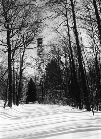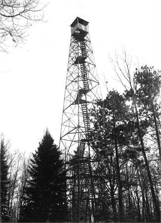 | Mountain Fire Lookout Tower Nicolet National Forest, Town of Riverview, Oconto County Fabricator: Aeromotor Company Date of construction: 1932 The Mountain Fire Lookout Tower is situated two miles north of the community of Mountain in Oconto County, in the Nicolet National Forest. The tower is a galvanized steel structure resting on four concrete piers. An interior stairway rises through the center of the tower to the lookout, or cab, at the top. Prefabricated by the Aermotor Company in 1932, the Mountain Fire Lookout Tower was initially erected by the Wisconsin Conservation Commission at another location in the Nicolet National Forest. In 1935, the tower was moved to its current site. The tower represents the cooperative effort of the USDA Forest Service and the Wisconsin Conservation Commission (now the Department of Natural Resources) to protect northern Wisconsin's timber resources from the ravages of fire. The two agencies developed a fire detection and suppression program in the 1930s. The fire lookout tower served as the central link in the fire detection system. Constructed on the highest points in an area, these towers were distributed so as to form a network that would keep the entire landscape under surveillance. During daylight hours from May through September, trained fire spotters kept constant watch over the surrounding area from the cab at the top of the tower. The Mountain Fire Lookout Tower is one of two remaining towers out of the 19 that once served the Nicolet National Forest. Fire lookout towers remained the prime method of fire detection in the Nicolet National Forest into the 1960s. The last fire called in from the Mountain Tower occurred on 25 April 1970. The Mountain Fire Lookout Tower is one of the last remaining structures associated with the CCC in the Nicolet National Forest. During the Depression years, the CCC was a major presence in the state and national forests of Wisconsin, and its men (and a few women) provided much of the physical labor that was associated with fire protection in these forests during this period. A local CCC camp is believed to have dismantled the Mountain Fire Lookout Tower and move it to its present site in 1935. Camp enrollees also manned the tower, and were assigned fire-fighting duties in the area through at least 1941. The tower is open to the public. |