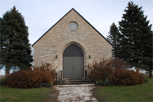 2024 - The chapel is a roughly one-and-a-half-story, front gable building, clad with Lannon stone. The roof of this Gothic Revival chapel is covered with slate. The façade, facing west, features a Gothic arch entry, surmounted by a traceried rose window. The entrance is comprised of a pair of metal doors under a lancet-arch composite panel, adorned with a wooden cross. These doors and the panel above replaced a pair of paneled wood doors and a lancet-arch wood screen that were present when the building was first added to the WHPD in 2004. The north and south elevations are nearly identical. These elevations each have stepped buttresses as well as two pairs of pointed-arch windows with leaded glass. Additionally, the north and south elevations feature a smaller, rectangular window (with leaded glass) near the western end and an arched, secondary wood door near the eastern end. Relatively new basement windows, below-grade, are installed on the north and south elevations as well. Stone corbelling is situated beneath the roof along these elevations. A stone chimney rises on the rear elevation, between the main body of the chapel and a one-story wing that extends to the east from the northern half of the rear elevation. This rear elevation has three fixed, wooden, six-light windows, one of which is on the shorter wing. A cornerstone is located at the chapel’s southwestern corner and bears the inscription “MEMORIAL CHAPEL 1938”.