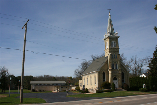 | Additional Information: | 1975: POINTED ARCH WINDOWS AND ENTRANCE. CORBELLED CORNICE W/RETURNED EAVES. SPIRE W/SQUARE CARVED FINIALS AT EACH CNR. STAINED GLASS. 2017: This property includes a church, parish hall, parsonage and barn, as well as a cemetery that is located across the road to the east. The Gothic Revival-style church (1902; AHI#13460) is constructed of cream brick and rises from a coursed, limestone foundation; a cornerstone identifies its 1902 construction date. A central, three-story bell tower is accented at the corners by brick buttressing and is topped with a tent roof that is surmounted by a cross. The wooden, double-door entry is set within a brick-trimmed, Gothic-arched opening, above which is a transom comprised of art glass. A stone inset above the doorway reads, “EV. LUTH. DREITNIGSKEITS KIRCHE” (translates to Trinity Evangelical Lutheran Church), above which is located a pair of Gothic-arched windows. A tripartite window grouping rests immediately below the bell tower which is enclosed with wooden louvers on all fours sides. Small, tower-like finials accent each corner of the bell tower roof. A single, lancet window is located to either side of the tower and corbelled brickwork trims the roofline. Side walls of the church feature four, Gothic-arched openings with art glass windows (installed in 1949), while modest brickwork runs below the roofline; a one-story, flat-roof wing (1938) extends from the rear of the main block. The interior of the church proper remains largely intact. A small vestibule opens into the nave, which features a central aisle and pews to either side, with side aisles separating the pews from the side walls. The sanctuary is raised by two steps and includes the original altar and screen; the pulpit is located to the right (north), while the lectern and baptismal font are in place to the left (south). Two small rooms (the sacristy and the former vestry) are located to either side of the sanctuary. At the rear (east end) of the church, a small door at the southeast corner provides access to the choir loft that is supported by a pair of columns. The 1938 addition originally included Board room space, as well as a small pastor’s office; this space now includes restrooms. Connecting the rear wing and the 1964, Lannon stone-sheathed, Sunday school and parish hall (AHI#434414) is a small hyphen faced with board and batten siding. The easternmost portion of the L-shaped wing has a flat roof, while the westernmost portion is topped with a gabled roof. The flat-roofed section includes Sunday School rooms, office space, restrooms and a kitchen. The slightly higher gabled section is a Fellowship hall and features clerestory lighting. The smooth stone of the fellowship hall wing includes three inscribed quotes from the Bible. They read: “I am the way, the truth, and the life,” John 14:6; “Suffer the little children to come unto me and forbid them not,” Mark 10:14; and “The fear of the lord is the beginning of wisdom,” Psalm 111:10. Windows throughout this wing are either casement or paired slider-type examples. To the north of the church is a two-story, gabled parsonage (1874; AHI#220086) covered with vinyl siding and including modern windows, while a gambrel-roofed, barn (1919; AHI#220087) with vertical board siding, two overhead garage doors and a gabled dormer is located just north of the house. Across the road is the cemetery, which is outlined along the roadway by a Lannon stone wall with a pair of driveway markers (1941; AHI#220088). Trinity Evangelical Lutheran Church of South Mequon was founded in 1853, with the first services being held in a log school house previously located at the present-day corner of STH 57/N. Cedarburg Road & W. Donges Bay Road. The congregation’s first church building was dedicated in August of 1855 and was located in the approximate center of where the present cemetery is located. In 1874, following the 1868 purchase of land across the road to the west, a parsonage was built and, in 1893, an additional half-acre was purchased adjacent to the original church in order to expand the cemetery. In 1902, the subject brick church was built south of the parsonage at a cost of $6,830.00. The parsonage was remodeled in 1917 and again in 1948. A new barn was built in 1919. The one-story addition to the church was completed in 1938 and the art glass windows were installed in 1949 following receipt of a $5,400 donation from the Julius Schnuckel estate. The parish hall addition was completed in 1964 and, in 1941, the Lannon stone cemetery wall was constructed. Until last year, the church served Mequon-area residents as Trinity Lutheran, as a member of the Wisconsin Evangelical Lutheran Synod. The congregation has since merged with Calvary Evangelical Lutheran Church in Thiensville (247 S. Main Street); however, at present, they continue to maintain both properties under the name Christ Alone Evangelical Lutheran Church. |