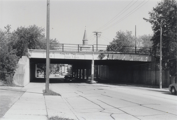 | Additional Information: | This deck girder bridge carries the railroad tracks over Washington Road in the City of Kenosha, and employs a simple post-and-beam structural form. Rolled "I" beams extend between two concrete abutments and are supported in the middle by a pier with "I" beam uprights and an "I" beam top chord. This structure was built in 1930 by the American Bridge Company. The bridge postdates the railroad's arrival in Kenosha by approximately 75 years. steel beam or plate girder bridge |