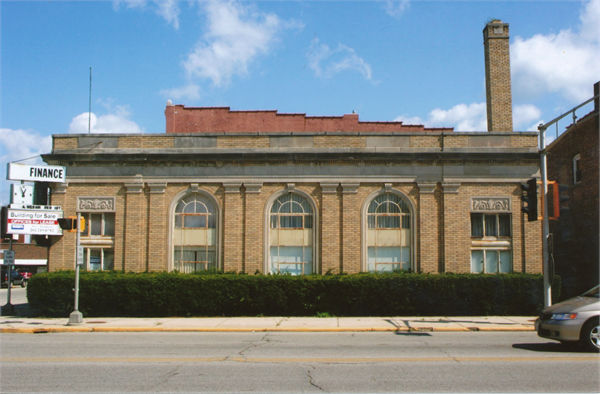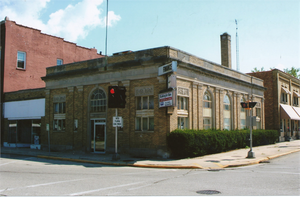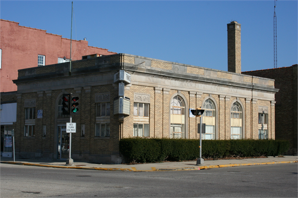 2010: Neoclassical in style and rising from a concrete foundation, this structure is faced with brick. Oriented to the Village Square, the structure’s primary (west) central entry is set off by a pair of brick pilasters to either side and within a tall, stone-trimmed, round arch accented by a central keystone. The replacement glass door and sidelight is topped with a multiple-light, steel-sash window. Each of the outer two bay divisions carries a rectangular, steel sash window that is topped with a carved stone header that includes a foliated design, as well as a cartouche-like element. The pilasters support a stone entablature which is inscribed with “WALWORTH STATE BANK.” A line of dentil trim and a modest stone cornice rests immediately beneath a brick and stone parapet. The structure’s south elevation is divided into four bays by paired, brick pilasters. The outer two bays carry the same rectangular window arrangement and carved stone header found along the west elevation, while the remaining center bays feature a round-arched, multiple-light, steel-sash window set within a stone arch. Circa-1960s signage, which includes a clock and information marquee, extends from the south corner of the building.