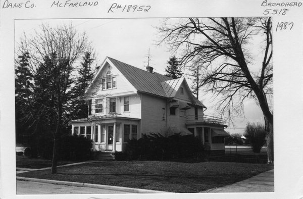 | Additional Information: | PALLADIAN MOTIF GABLE WINDOW W/ FANLIGHT TRANSOM W/ KEYSTONE WOOD SHINGLED GABLE*DENTILLED LINTEL COURSES IN FRONT GABLE POLYGONAL SIDE BAYS UNDER GABLES BALCONIED REAR PORCH 2016- "Built around the turn of the century, this house preceded the Parsonage at 5508 Broadhead. It is a Classical Revival style house with a fine example of Palladian windows in the front gable. The house is rented out by Cottage Quarter LLC in Monona WI." -"Historic McFarland: A Walking Tour" booklet, Third printing, published by the McFarland Historical Society, (March 2016). |