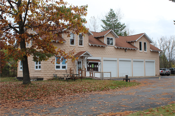 2025: The Crandon Ranger Station was constructed by the WPA and WCC in 1936 and embodies the “office and five-stall garage” plan from this period. This 1 ½ story building is rectangular in plan with a concrete foundation, rock-faced concrete block walls, and an asphalt-shingled side-gabled roof with overhanging eaves and exposed rafter ends. The front elevation faces south and is asymmetrical in composition with a pedestrian-scale entrance and a pair of replacement windows at the west end of the façade and five garage bays across the remainder of the space. The westernmost garage by has been infilled with vinyl siding and contains a recessed information board under a shed-roofed awning. All other garage bays contain replacement metal overhead doors. The pedestrian entrance is sheltered under a gabled awning with exposed rafter ends and wood braces. The upper story of the building features three gabled wall dormers. The outer two dormers are larger than the center dormer; the western dormer contain two one-over-one windows while the eastern dormer contains two replacement single-pane, fixed-sash windows. The smaller center dormer contains a pair of single-pane fixed sash or sliding windows and is clad in wood clapboard. A second entrance to the office end of the building originally existed in the west wall of the building; this doorway has subsequently been infilled with concrete block though a concrete stoop remains to indicate its former location. |
