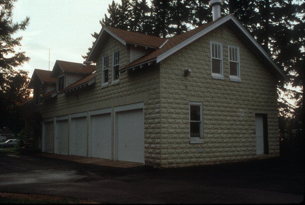 1991: This one and a half-story structure features a rectangular shaped plan configuration, a concrete block foundation, a rock-faced concrete block stone exterior, a wood trim, and an asphalt shingled multi-gabled roof. A new roof replaced the original in 1964. (See Bib. Ref. B). Bungalow windows appear on the second story. Exposed rafter ends, elements characteristic of the bungalow style, are part of the architectural design as well. The interior is designed with plaster finishes. The garage doors are also new, added on at an unspecified date. The structure is in good condition.