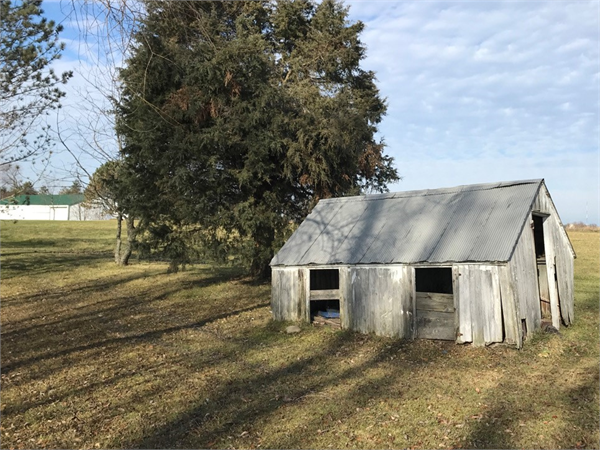 | Additional Information: | This building stands on the historic Mike Hensgen farmstead. While the house and two small outbuildings stand in Section 9, this and most of the farm buildings stand in Section 10. This small wood shed stands east of the small pond, on the edge of the pasture beyond the farmstead complex. It is older than most other buildings on the property, but county records do not indicate its date of construction. It has a metal gabled roof; the sheets are a historic material. A single door is set in the west end-wall, and its door is missing. The vertical wood boards are weathered and peeling away from the base of the structure. A window is set on its south wall. It is in poor structural condition. This building is not individually eligible. The farmstead as a whole is also recommended not eligible for listing in the NRHP. |