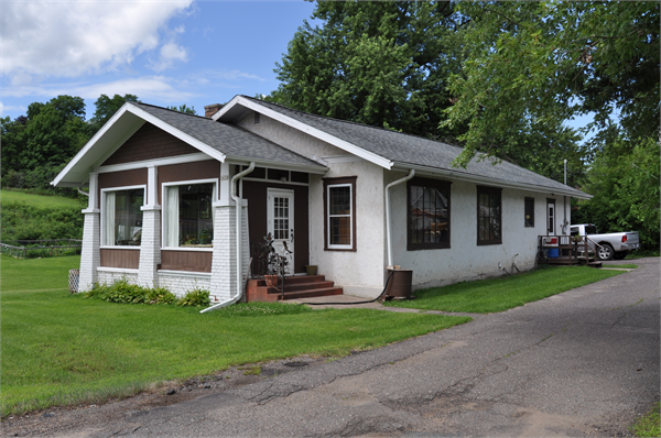 | Additional Information: | Surveyed in July 2020 by UWM-CRM as part of the WisDOT USH 63 reconstruction project. This one story bungalow was built around 1910. The house is rectangular in plan with a front-gabled roof. A gabled front porch occupies the east half of the front (south) elevation. The body of the house is clad in rough stucco, and it has a composite shingle roof. The porch has battered brick piers topped with short, square, wood columns. The porch bays have been framed out and are clad in T-111 board and have large fixed picture windows. The gable of the porch appears to retain its original shingle cladding. Fenestration in the rest of the house consists of multi-light fixed and double hung windows. |