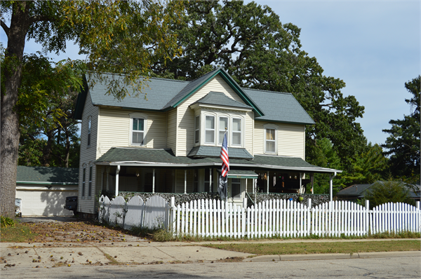 | Additional Information: | This two-story Side Gabled house was constructed c.1900. It is rectangular in plan with vinyl siding and an asphalt-shingled gable roof. The front elevation faces south and is dominated by a central, projecting, two-story bay that is capped by a gable roof and features a prominent bay window at the second story. This window features a dentilated cornice and a row of segmentally-arched window openings that are set with replacement one-over-one windows. A one-story, hipped-roof porch spans the façade of the building; the porch features turned wood supports and balusters. The front entrance is located at the base of the center bay. Individual two-over-two windows in arched openings are located above the porch, at the second story, on each side of the center bay. |