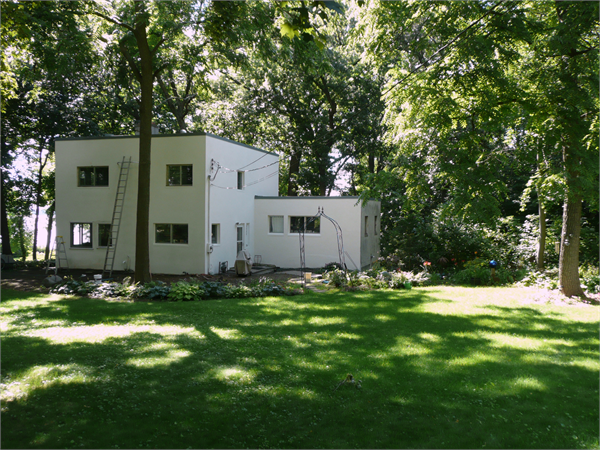 Additional Information: | The earliest International style house in Frost Woods was also the first in Wisconsin. The Wright and Ednah Thomas House, built in 1931, was designed by Beatty and Beatty in collaboration with the Thomases, both English professors. The house is a stuccoed box whose circular form of the lakeside porch is clearly influenced by Le Corbusier's work of the same period, such as the Villa Planeix of 1927. 2018 - The house was constructed in 1931 and designed by architects Hamilton Beatty and Allen Strang for Charles Wright Thomas and his wife Ednah Shepard. Beatty and Strang designed several other International style homes in Frost Woods and along Winnequah Road. The asymmetrical house rests on a poured-concrete foundation and its footprint consists of two interconnected one- and two-story cubic portions that give the building voluminous massing. It has a flat roof and no eaves. The residence is constructed of concrete blocks and exterior walls are clad in smooth white cementitious stucco. Fenestration consists of fixed-frame and one-beside-one sliding sash windows. An interior concrete chimney protrudes from the two-story portion. The exterior has no decorative features. Two garage bays are located at the exposed basement level underneath the one-story mass. The voluminous massing, lack of ornamentation, and sleek exterior finishes are character-defining features of the International style. 2022 - Resurveyed for district DOE |