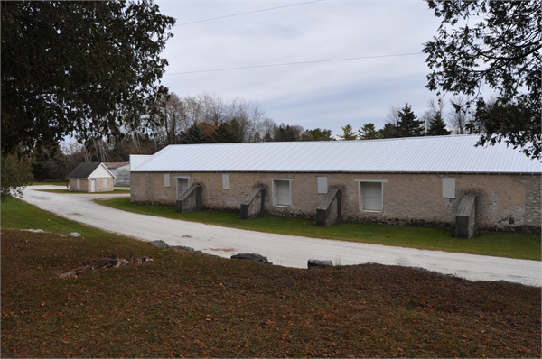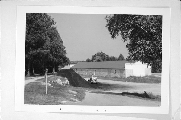 The frame shed (AHI #244696) is clad in vertical boards and has a standing seam metal roof. The main elevation contains four sets of large vehicular doors. This building probably dates to the late 1920s, after Kewaunee County began leasing the property for use as highway department repair shops.