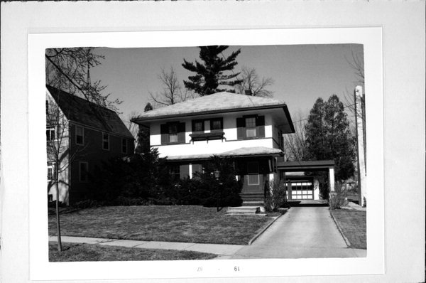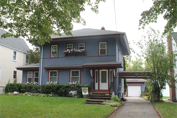 | Additional Information: | Fine Prairie School design with unusual rolled roof on all roofs including the hip roof sunporch ell on west facing facade. The hip roofed entrance porch with its curved and panelled supporting brackets and the pent roof above the window group to the left of the entrance. The wide, overhanging boxed eaves have stucco coated soffits. A wooden sringcourse encircles the house below the 2nd floor window sills. A flat roofed porte-cochere on the east facing facade covers a side door., The wooden shutters are later additions. #650: Garage is original to the house with stucco siding and rolled hipped roof. Green Bay Intensive Survey Phases 2, 3 & 4 |