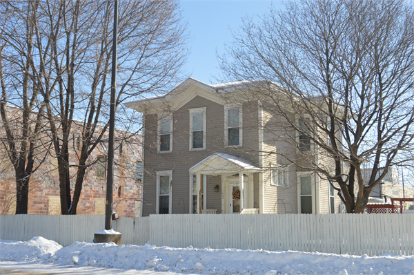 | Additional Information: | Paired brackets under the eaves; front gablet; projecting window cornices with punch-out design over long four over four windows; two-story hip roofed projecting west bay; east bay window; arched sidelighted entrance door; one-bay open gabled porch with turned posts; rear addition. Feb. 2021: This Two Story Cube house was constructed c.1890. It is rectangular in plan with vinyl siding and an asphalt-shingled hipped roof with a gablet at the center of the façade, wide overhanging eaves, and a wide cornice board with decorative detailing. The front elevation faces northwest and is asymmetrical in plan with an off-center front entry porch. The porch has a gable roof and turned wood supports. The front door features a wood surround that appears to be a replacement for earlier sidelights. North of this are two 1-over-1 windows. The second story of the façade contains three evenly spaced 1-over-1 windows. All windows have wood surrounds with decorative carving along the crown. |