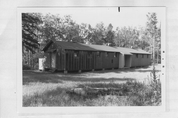 | Additional Information: | A 'site file' (Hayward Nursery) exists for this property. It contains additional information such as correspondence, newspaper clippings, or historical information. It is a public record and may be viewed in person at the State Historical Society, Division of Historic Preservation. This one-story astylistic utilitarian storage building features a rectangular shaped plan configuration, a concrete block foundation, a wood trim, and a rolled asphalt covered gable roof. The exterior wall material is comprised of board and batten and tar paper. (According to the survey report, the Town, Range and Section of this structure is 41 09W-33). See photo codes SY 9/9 & 9/13 for district shots. Description of Complex: The Hayward State Nursery (41 09W-28) is located just southwest of Hayward off of US Highway 63 in Sawyer County. All of the cone extraction and seed storage for the state nursery program is done at the Hayward Nursery. This complex consists of a variety of buildings, a complex of storage buildings (9/6, 7, 8, 9, 10; 1936), the office (9/5; 1936), an old cooler building (9/15; 1936), a pump house (9/16; 1936), and dormitories of an historic CCC camp (9/11, 12; 1936). The nursery as a whole is laid out in a rigid grid, for planting, irrigating and harvesting seedlings. The buildings within this complex are arranged in three distinct areas: The main office and storage complex; the river complex including the pump house, the old cooler, and the extractory; and finally the CCC camp which includes a West Side Camp building and an East Side Camp building (which have been converted into storage buildings). The first area, which includes the office, is in excellent condition and very well maintained. The buildings are all wood structures with clapboard siding and wood trim, and have all been painted aubusson green with white trim. They are all situated to create an outdoor room; a courtyard for service vehicles. The larger buildings are considered garages and are accented by vertically hung swinging doors. The office is quite detailed with exposed rafter tails, roof brackets and white wood portico piers. The buildings located by the river, the pump house and the old cooler building are also in excellent condition and are constructed in a similar manner to that of the main storage complex, with aubusson green wood clapboard, white wood trim and exposed rafter tails. The thrid area, the converted historic CCC camp, consists of two buildings both constructed in 1936. The buildings are constructed with wood board, tar paper and battens. This type of construction was very typical of CCC camps in Wisconsin, espically for dormitory type buildings. These were the only two existing buildings of this sort that were found on the 1991 State Facilities Survey and were in good condition. This third area was unique because it was highlighted by a circular ring of trees probably planted when the camp was active. |
