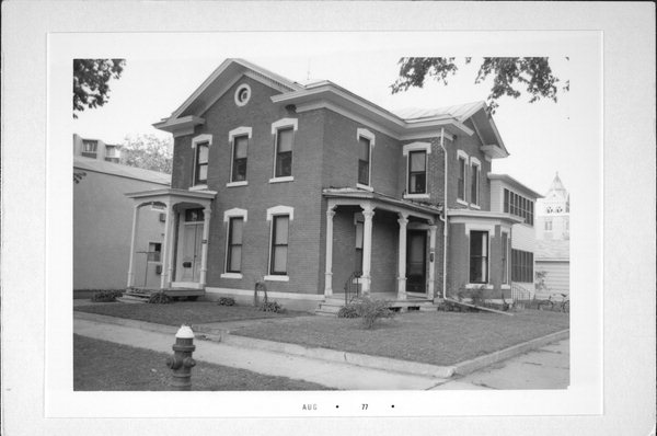 | Additional Information: | Hip with cross gable porch flat cornice returns and oculus in gable ends; front and north side cross gable; two story gable roofed rectangular bay wth three sided bay window on south side; triangular pediment shaped stone widow heads with incised floral design overlong narrow windows; one bay open entrance porch with carved square posts on paneled bases; double leafed entrance door; side porch of similar design in south angle of house. Having retained its architectural character, this Victorian brick house is a good example of a builder constructed house influenced by the Italianate style. The Gilbertson House is an excellent example of vernacular brick residential architecture in La Crosse. Andrew Gilbertson, a laborer, first lives at the northeast corner of 8th and Winnebago in 1876. This later becomes 727 South Eighth and still later 729 South Eighth. Apparently this house was brick veneered sometime after it was constructed as a frame house. 2017 UPDATE - NOT EXTANT |