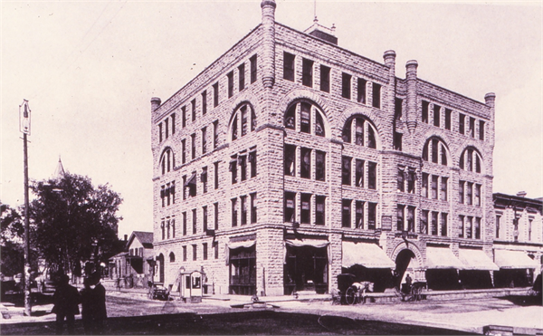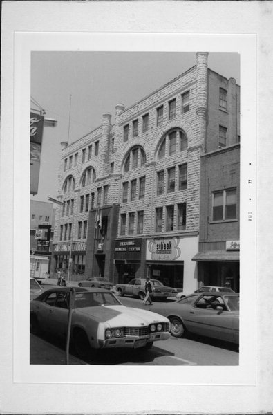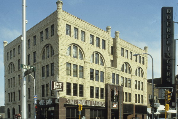 | Additional Information: | Massive four-story round arches on south and west facades; plain rectangular windows with round arched grouping in the top of the round arches; battlements at ends of building and framing the recessed central entrance bay in the facade; massive round arched central entrance was removed when contemporary front of brown stone was added; rear elevations are brick. Constructed in 1885-1886 by Alexander McMillan, a local investor and realtor, on the site of a city park featuring an artesian well, the McMillan Building, originally used as a business block and now known as the State Bank Building, constructed of local stone. Unfortunately the store front has been altered, eliminating the massive oricles on the lower story. Alexander McMillan was an important La Crosse figure. He was involved in civic affairs, local politics, and in the local finanical network. He was one of La Crosse's lumber barons. McMillan had other interests, such as banking, and played a role in civic affairs. He became mayor in 1871. He was active in the Board of Trade. The State Bank of La Crosse was one of the three main financial institutions of the city. |