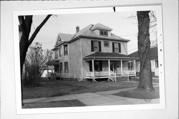 | Additional Information: | Large example which has been resided. Large picture window left of entrance door has leaded glass transom. There is a two and a half story tall polygonal, gable roofed bay on the west facing facade with the gable roof closed by a pent roof with intact scrollwork, corner brackets below. Ell has a side porch adjacent to the rear. Garage is a large three-stall later building. Eli Routhieaux was a plasterer. Green Bay Intensive Survey Phases 2, 3 & 4 |