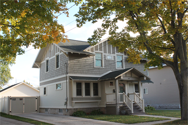 | Additional Information: | Originally, one of Green Bay's better Craftsman designs, now being insulated and resided. Wide overhanging eaves have exposed rafter ends beneath with decoratively sawn ends, all of which are supported by large knee braces. The second floor is wood shingle sided and the gable ends are sided in stucco with vertical wooden boards in half-timber style. The entrance porch is supported by battered piers with lattice-like capital ornamentation. The porch roof is carried on massive beams while the base of the porch's gable end has a large mitered arch shaped base. Shallow shed roof covered oriel windows are placed on either side of the entrance. The right, or easterly corner of the main facade is canted and there is a hip roof oriel window supported by heavy brackets below placed on east facing facade. Garage is a modern building. Green Bay Intensive Survey Phases 2, 3 & 4 |