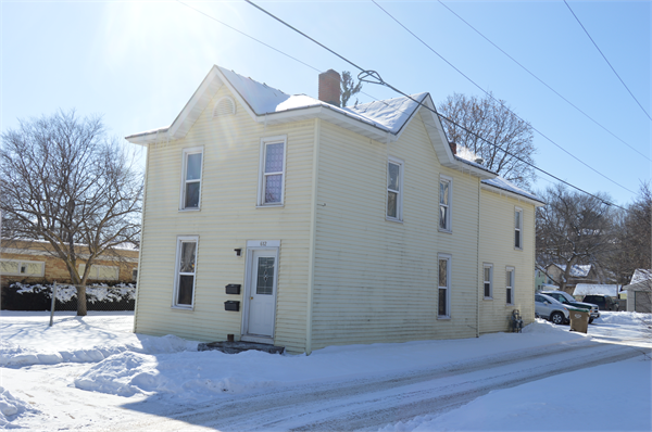 | Additional Information: | Rear two story gable roofed addition; gabled door hood. Feb. 2021: This Two Story Cube house was constructed c.1880. It is rectangular in plan with vinyl siding and a metal-clad hipped roof with a steeply-pitched gablet on the primary façade. The front elevation faces northeast and is asymmetrical in plan with a single door and a 1-over-1 window at the first story and two 1-over-1 windows at the second story. The front door is accessed via a shallow concrete stoop. |