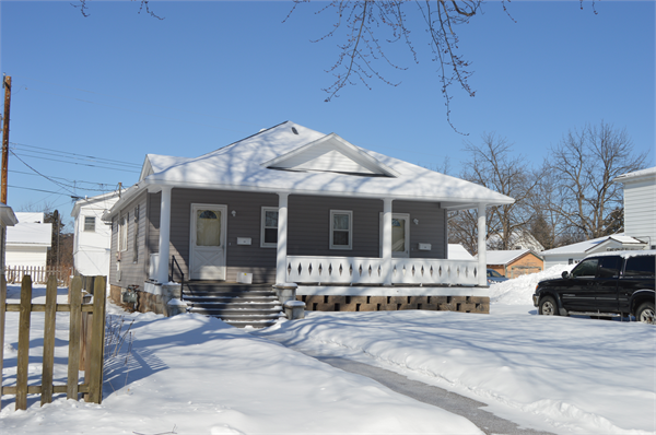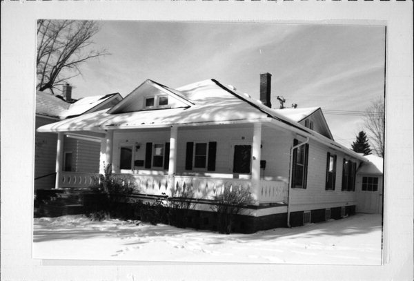 | Additional Information: | Gable roof dormers; full-length open front porch with cut-out filled in rail supported by Tuscan columns. Feb. 2021: This 1-story bungalow was constructed c.1910 as a duplex. It is rectangular in plan with a cast stone foundation, vinyl siding, and an asphalt-shingle hipped roof. The front elevation faces southeast and contains a full-width recessed front porch. The porch features columnar supports with flat panel balusters with diamond-shaped cutouts. A set of wooden steps is located at the south end of the porch. Inside the porch are individual doors located at each end with small 1-over-1 windows between. Blind front-gabled dormers project from the front and side roof slopes. |