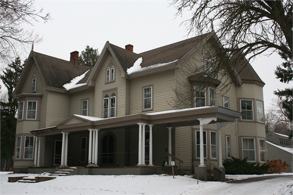 This house was built between 1862 and 1863 for John Holly and Valeria Knapp. Born in New York in 1825, John Holly Knapp grew up in Ft. Madison, Iowa, a city founded by his father Gen. John H. Knapp. In 1846, the younger Knapp, along with Capt. William Wilson, came to present-day Menomonie and purchased of David Black a half interest in a sawmill on the Red Cedar River. Black died shortly thereafter and Knapp purchased the other half; this resulted in the firm of J.H. Knapp & Co., with Wilson as a silent partner. In 1850, the firm’s ownership expanded to include Capt. Andrew Tainter and the firm was renamed Knapp & Tainter. Three years later (in 1853), a fourth owner joined the group, that of Henry L. Stout. With holdings in four different states, Knapp, Stout & Co. was formally established in 1878 as a corporation, with Knapp serving as president.