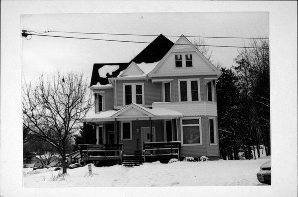 Additional Information: | THIS ELABORATE, QUEEN ANNE, TWO-STORY FRAME HOUSE HAS VARIED ROOF FORMS AND SURFACE MATERIALS. A HIP ROOF IS INTERSECTED BY TWO PEDIMENTED GABLED ROOFED, THREE-SIDED BAYS - ONE PROJECTING EAST AND ONE SOUTH. A RECTANGULAR BAY TO THE NORTH AND A SMALL GABLE ROOF ACCENT ON THE EAST SIDE ALSO EXTEND FROM THE MAIN HIPPED ROOF. DOUBLE ENTRANCE DOORS, BRACKET DECORATED CHAMFERED CORNERS, A FLARED UPPER STORY, DECORATIVE SHINGLES IN THE GABLE END AND AT THE SECOND FLOOR LEVEL, A PEDIMENTED GABLE ROOF OVER THE PORCH ENTRANCE, AND A ONE STORY EXTENSION AT THE REAR WITH A SMALL INSET PORCH SUPPORTED BY TURNED POSTS CHARACTERIZE THIS LARGE, VERNACULAR DWELLING. CANTED BAYS, CORNER BOARDS, FRIEZE BOARDS, BALUSTRADES AND SPINDLE WORK DETAILING ARE ALSO PRESENT ON THE STRUCTURE. UNFORTUNATELY, THE PORCH HAS BEEN ALTERED, DETRACTING FROM THE ARCHITECTURAL SIGNIFICANCE OF THIS RESIDENCE. THIS HOUSE WAS BUILT AFTER 1896 AND WAS RESIDED IN VINYL IN 2005. Previously surveyed in 2004. |