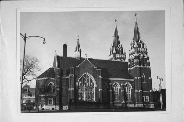 "West Mitchell Street is best known to Milwaukeeans for its many businesses and shops, but it is also the site of several prominent churches-St. Vincent de Paul, St. Anthony, St. Stanislaus, and the present one. St. Jacobi's broad facade, with triple entryway flanked by two massive towers, dominates the busy intersection of South 13th, West Mitchell, and West Forest Home. Dedicated on October 14, 1906, this monumental brick and stone structure replaced the congregation's first church, built in 1873. That small brick building, converted in 1905 to serve as parish hall, still stands nearby, as do the church school of 1882 and the parsonage of 1904." Pagel, Mary Ellen & Virginia A. Palmer, University Extension University of Wisconsin, Guides to Historic Milwaukee: Walker's Point and South, 1969. |