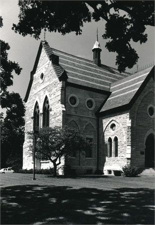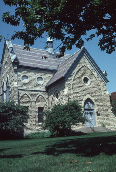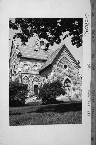 | Additional Information: | Architecturally significant as one of the finest extant examples of Victorian Gothic architecture in Beloit, Memorial Hall was designed by the architectural firm of Cochrane and Garnsey. It is distinguished by massive walls of heavily rusticated limestone, steeply pitched gables, and pointed arched details. The exterior has never been altered, and the interior has never had significant changes made. Based on an L-shape plan, with two intersecting gabled units, the two story structure, with a basement, is crowned with a thin cupola and cresting along the gable ridge. Projecting gablets ornament the east and west gables while buttresses support the corners. Pointed arch stone trim divides the facade creating an arcaded effect. On the east elevation, two pointed arches rise two stories and contain paired lancet windows. On the north elevation, the entry is surmounted by wooden tracery and a quatrefoil window., and surrounded by a pointed stone arch. Circular windows punctuate the upper stories.