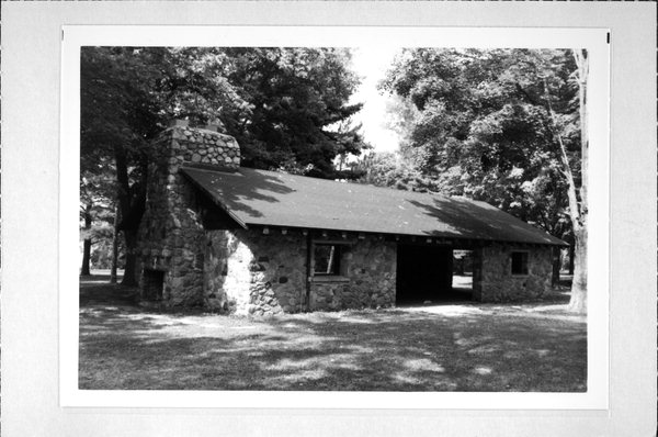 The other coherent group of buildings is located within the Mauthe Lake Recreation Area, near New Prospect. At Mauthe Lake, there are three main structures that are constructed of similar materials, and some improvements that share similar construction techniques. The bath house (59/13, 1939), the lakeside shelter building (59/14, 1939), and the campground shower building (59/13, 1939). All three buildings are Rustic style, constructed of large fieldstones, with camp brown wood trim. A unique feature to the bath house and the shower building are windows that are framed above eye level, essentially serving as clerestory windows. The lakeside shelter building has a dog trot style plan, with a massive fieldstone chimney on the north side. The chimney has an exterior fireplace as well. All of the buildings have exposed log rafter tails. The grouping at Mauthe Lake is in excellent condition.