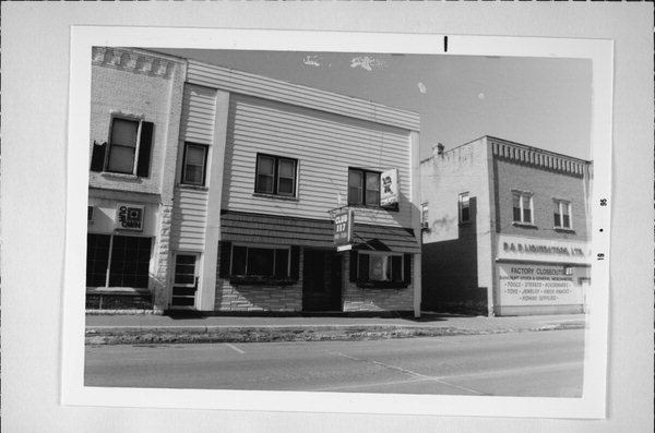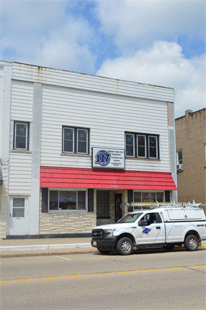 | Additional Information: | This 2-story Commercial Vernacular building was constructed in 1922. It is rectangular in plan with stone veneer and aluminum siding and a flat roof. The front elevation faces east and is asymmetrical in plan with a narrow bay along the south end of the façade that contains a single door providing access to the second story; a single 1-over-1 window is located above this at the second story. The remainder of the façade contains a storefront that has been altered via the application of stone veneer siding and downsized windows. A recessed entrance is located at the center of the storefront. A wood shingled awning roof spans width of the storefront; above this, the second story contains a pair of 1-over-1 windows and a bank of three 1-over-1 windows. Vertical brick pilasters separating the storefront bay from the private entry bay and at the northern corner of the building have been clad in aluminum panels. |