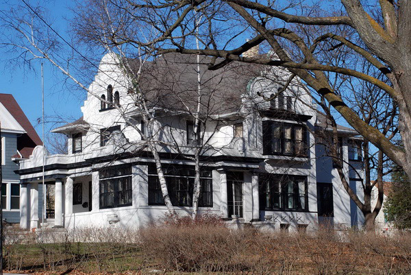 | Albert M. and Alice Bellack House 628 W. James St., Columbus, Columbia County Construction Date: 1897/1920-1923 The Bellack House is Columbus's only example of the Mission Style. This house began as a frame construction, clapboard-clad Queen Anne style building completed in 1897. It was still in an essentially unchanged state in the early 1920s when a trip by the Bellacks to the southwest introduced them to that region's Mission style buildings. Upon their return, Albert Bellack purchased the two corner lots adjacent to his own; he then tore down the small house located on these lots and set about transforming his old house into a Mission style one. This resulted in the elaborate Mission style remodeling of the south and east sides of the house, which were reclad in stucco. The Bellacks also constructed a long pergola that borders the driveway that leads up to the house from N. Lewis St. The stylistic transformation is all the more interesting for being incomplete, since the north and west sides of the house remain as they were originally. Today, the exterior of the house is still highly intact as is much of the interior, which also reflects the same partial stylistic transformation that the exterior of the house underwent. The Bellack House is a private residence and is not open to the public. Please respect the rights and privacy of the owners.