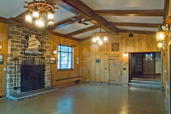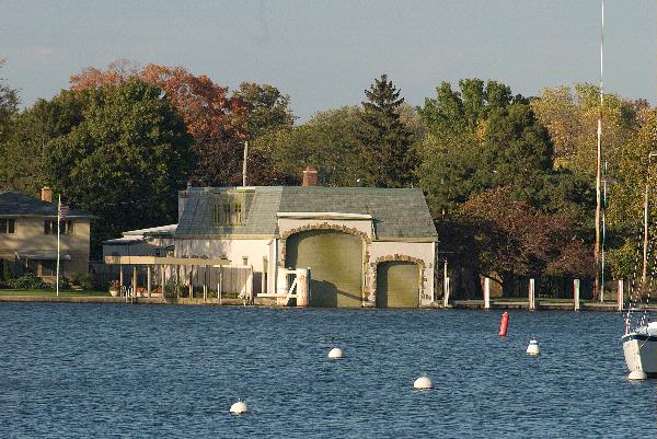 | Whiting Boathouse 98 Fifth Street, Neenah, Winnebago County Architect: Robert Messmer Dates of Construction: 1932, 1939, and 1946 Built and expanded during the Depression at an estimated cost of $100,000, the boathouse constructed by industrialist and millionaire playboy Frank Whiting is perhaps one of the finest remaining examples of the wealth and extravagance afforded by the paper industry during the early twentieth century. Designed by Milwaukee architect Richard Messmer, the boathouse was lavished with decorative features, including stone rowboat planters, maritime lanterns, and silhouette replicas of Whiting’s boats on the screen doors and fire screens found in the structure party rooms. Outfitted with a bar, grill, soda fountain and rooftop dancing pavilion, the Whiting Boathouse was a key venue in establishing Neenah as a site for the Inland Lakes Yachting Association regattas. The boathouse and its party rooms similarly were used to entertain touring tennis greats when they appeared at Western Hard-Court Tournament matches held at the Doty Tennis Club. Transferred to the city after Whiting's death in 1952, it has since then been used to house community functions and the city police boat. In addition to its historical significance, the Whiting Boathouse is an outstanding example of the application of the Spanish inspired Period Revival styles. Characterized by the use of rough stuccoing, stone quoins and heavy beam lintels, the structure also includes a mansard roof, which imbues the design with references to the French Riviera and relates appropriately to the waterfront location of the boathouse. Further enhancing the design are the massive arched entryway, the slate shingles, and a stepped chimney with molded brick stacks.