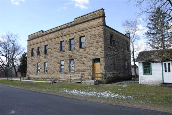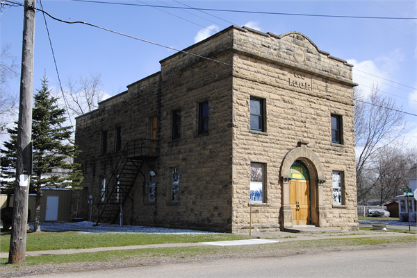 The Downsville Odd Fellows Lodge is an interesting, two-story free-standing building which exhibits elements of the Romanesque Revival style. The building's imposing appearance is enhanced by the use of locally quarried rough-faced sandstone blocks and a large Romanesque arch, which is centered on the main façade. The roof parapet has an arched center which features a cartouche carved with the construction date of 1908.