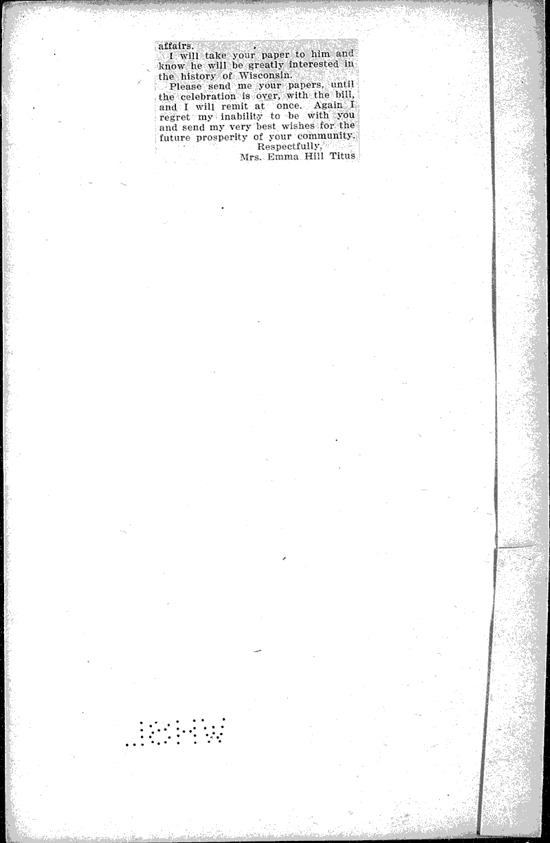 Letter from Mrs. Emma Hill Titus, the only remaining daughter of Bradford Hill, Waterloo's first settler