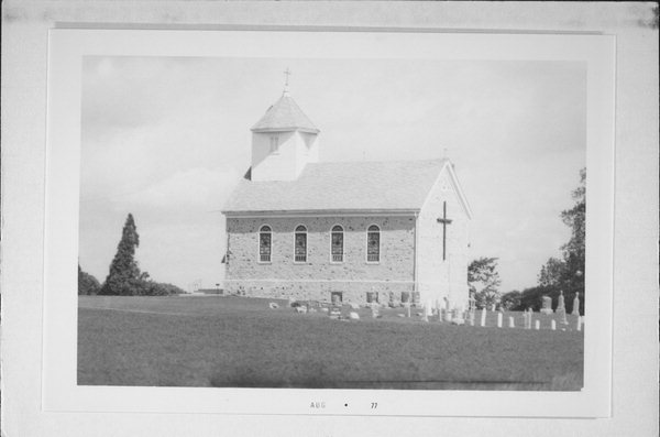 | Additional Information: | A 'site file' exists for this property. It contains additional information such as correspondence, newspaper clippings, or historical information. It is a public record and may be viewed in person at the Wisconsin Historical Society, State Historic Preservation Office. BUILT TO SERVE MISSION EST BY FATHER CASPER REHRL. HEAVILY MORTARED FIELDSTONE W/APPLIED MORTAR JOINTS. SCHOOL WAS RUN IN BASEMENT BY SISTERS OF ST. AGNES OF BARTON. OCTAGONAL PAVILION ROOF ON SQUARE CLAPBOARD BELFRY. CUPOLA. ROUND ARCHED STAINED GLASS WINDOWS. The church was in regular operation until 1985. |