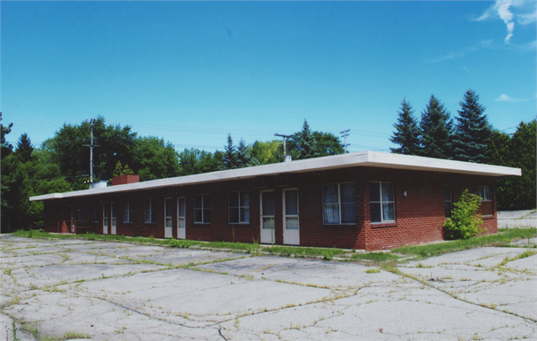 2010- "This newly-inventoried motel complex is located on the south side of University Avenue. The complex sits back from the roadway, behind a hedgerow and brick wall along University Avenue. The entire property is paved and separated from surrounding commercial development by mature treelines. Four elements comprise the complex: the main motel building, two other motel buildings, and a sign. The complex is currently vacant. The motel sign, which rests on an asymmetrical brick pylon, is located at the front of the property's entrance, and is partially visible from University Avenue. The sign structure (but not the current sign board) dates from 1957. The original signboard had a two-sided plastic face with traveling lightbulbs, and is still in place beneath the current sign. The complex's main building is centrally located and was erected in 1950 for John and Mildred Hamacher. The onestory building is faced with red brick and rests on concrete foundation. The flat, built-up roof features broad eaves. A brick pylon or chimney rises through the roof on the north elevation. The building's fenestration carries one-over-one double hung windows with brick rowlock sills. Some of the windows have been covered by plywood. Most of the doorways appear intact and carry original doors. The building's features are characteristic of 1950s-60s commercial architecture.