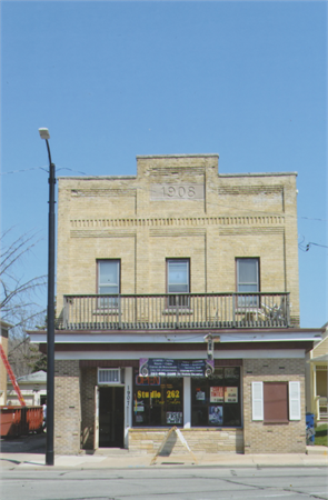 | Additional Information: | This 2-story Commercial Vernacular building was constructed in 1908. It is rectangular in plan with brick, stone veneered, and brick veneered walls and a flat roof with a stepped parapet. The front elevation faces west and is asymmetrical in plan due to uneven fenestration across the first story. The first story contains a central pair of 9-pane shop windows, one doorway, and one boarded-over window opening with decorative shutters. The wall below the shop windows is clad in stone veneer and the remainder of the first-story fagade is clad in brick veneer. A flat roof projects across the fagade above the first story and serves as a second-story balcony with modern wood railings. The second story contains three 1- over-1 windows; each second story bay is separated by vertical brick bands capped in decorative corbelling. The building is in good condition but retains a relatively low degree of integrity due to the loss of original shop windows and first-story wall cladding. Because of its diminished integrity (specifically, the loss of its character-defining shop windows), the building is not a particularly fine representative of Commercial Vernacular architecture. This building has not been previously surveyed. A new AHI record was created. |