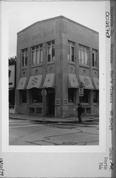 Additional Information: | Architectural Description: The First State Bank Building was originally constructed between 1890 and 1895 [B], and was a brick building with rubble stone on the north side. Prior to 1917 the building was operated as a saloon. [B]. The present appearance of the facade resulted from a major remodeling in the late 1920's. The exterior of the facade and north elevation is now veneered with stone. The smooth stone corner piers frame the window area which is divided into three vertical sections by fluted pilasters. Stylized, flat capitols top the pilasters, and suggest Corinthian capitols. Similar motifs appear in panels at the top of the corner piers. Stylized paterae are placed in the spandrels between first and second story windows. The smooth stone surfaces, stylized ornament and large scale windows emphasize the mass of the building, creating a monumental design. The structure is in good condition. It was owned in 1982 by Sandra L. Hager c/o Mae's Flower Shop. Architectural Significance: The First State Bank is important in the Downtown Historic District, and within the city, as one of the few buildings exhibiting a Moderne influence. Historical Statement: The First State Bank Building is first listed at this address in the 1913-1914 City Directory. The 1911-12 Directory lists a saloon at this address. The bank became the Waukesha Savings & Loan in 1937-38 and in recent years, turned to other commercial activities. [D]. |