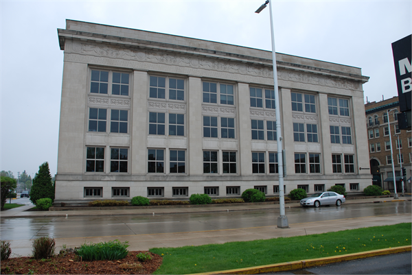 This office building, encompassing nearly a block was constructed in three phases between 1922 and 1937 as an imposing expression of the Beaux-Arts Classical style. Built of Bedford limestone, a more impressive and costly material than brick, it has a principal facade that is dominated by a three-story colonnade of engaged Doric columns, which support a classical entablature. But what is most striking is the building’s wealth of bas-relief carvings. Between the first and second stories, the spandrels that separate the expansive paired windows display the seals of the states in which the Hardware Mutual Insurance Company did business, and the metal spandrels between the second- and third-floor windows are embossed with a classical asterisk. Greek fretwork ornaments the stone cap along the top of the raised foundation, and griffins and the seals of the United States and Canada adorn the frieze above the colonnade. At the center of the main (east) facade, the ornate molding around the doorway features allegorical figures in niches. Sculptor Ulysses Ricci of New York carved these figures.