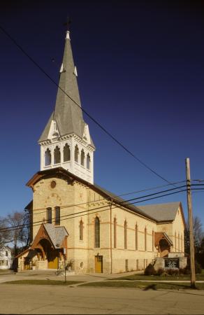 | Additional Information: | A 'site file' (Zion Evangelical Lutheran Church and Parsonage) exists for this property. It contains additional information such as correspondence, newspaper clippings, or historical information. It is a public record and may be viewed in person at the Wisconsin Historical Society, Division of Historic Preservation-Public History. POINTED ARCHED WINDOWS, POLYCHROME BRICKWORK, OPEN BELFRY IN STEEPLE W/CINQUEFOIL ARCHES, GABLED ROOF OVER ENTRY W/KING POST TRUSS AND BARGE BOARDS. THE BELL FOR THE CHURCH WAS CAST FROM 5 CANNONS CAPTURED DURING THE FRANCO-PRUSSIAN WAR AND GIVEN TO THE CHURCH BY KAISER WILHELM, EMPEROR OF GERMANY. IT WAS CAST IN BALTIMORE BY A GERMAN MASTER AND WEIGHS 1,600 POUNDS. A LATIN INSCRIPTION ON IT READS "I CALL THE LIVING, I MOURN THE DEAD, I BREAK THE LIGHTENING!". THE ADDITION AT THE REAR OF THE BUILDING WAS BUILT IN 1887. IN 1896, THE STEEPLE WAS STRUCK BY LIGHTENING AND REBUILT. Exceptionally fine High Victorian Gothic style polychromatic brick church designed by Milwaukee architect Edward Townsend Mix, and built in 1878 with Richard D. Vanaken as carpentry contractor and Henry Bolte as masonry contractor. In 1887, an increase in the size of the church neccessitated the expansion of the church, which consisted of a 40-foot x 50-foot addition to the rear of the nave in the same style. "This church building is a fine example of the Victorian Gothic style. The most distinguishing feature of this style is the polychromatic exterior finish. Bricks of differing colors create decorative bands and highlight arches on the building exterior. The wall surface is further decorated with masonry corbelling at the eave line and a rusticated stone foundation. The prominent square belfrey features an arcade of three ornamented trefoil arches on each side. The bell for Zion Church was cast for five cannons captured during the Franco-Prussian War and given to the church by Kaiser Wilhelm, Emperor of Germany. The bell was cast in Baltimore by a German master and weighs 1,600 pounds. On its surface is the Latin inscription (translated) "I call the living, I mourn the dead, I break the lightening!" The addition at the rear of the building was built in 1887. In 1896 the steeple was struck by lightening and rebuilt." Columbus Historic Architecture Tours, undated. |