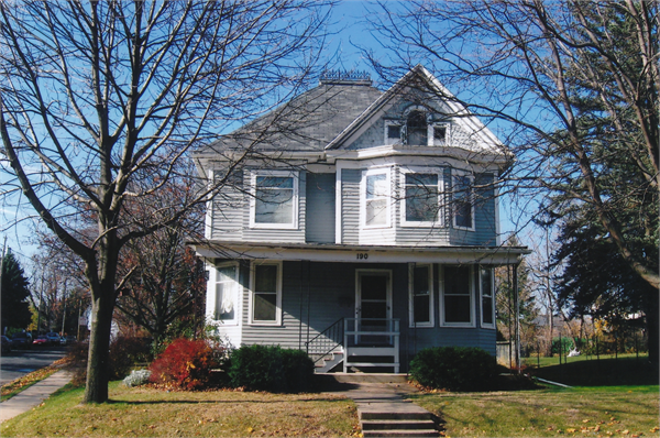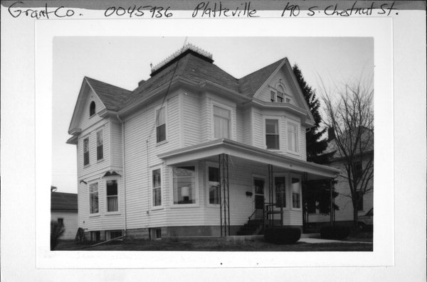 Additional Information: | THIS LARGE, TWO-STORY FRAME HOUSE HAS A TRUNCATED HIP ROOF AND IS TRIMMED WITH CRESTING ON THE DECK. THERE ARE TWO GABLED ROOF EXTENSIONS, BOTH OF WHICH ARE PEDIMENTED AND SHINGLED. THE FRONT GABLE HAS A PALLADIAN WINDOW, AND STANDS ABOVE A THREE-SIDED BAY. THE SOUTH SIDE GABLE HAS CORNICE RETURNS, A ROUNDED ARCH WINDOW AND BENEATH IT ALL IS A RECTANGULAR BAY. CHAMFERED CORNERS ON THE SOUTH SIDE ARE DECORATED WITH BRACKETS AND PENDANTS. LEADED GLASS, FRIEZE BOARDS, CORNER BOARDS AND WINDOW CORNICES ARE OTHER FEATURES OF THIS VERNACULAR QUEEN ANNE HOUSE. THE FLAT ROOFED FRONT PORCH HAS BEEN COMPLETELY ALTERED. ARCHITECTURAL SIGNIFICANCE: THIS HOUSE IS ONE OF FOUR HOUSES WITH CRESTING REMAINING IN PLATTEVILLE. OTHERS ARE GT 32-31, GT 27-26, "A" AND GT 1-20. |