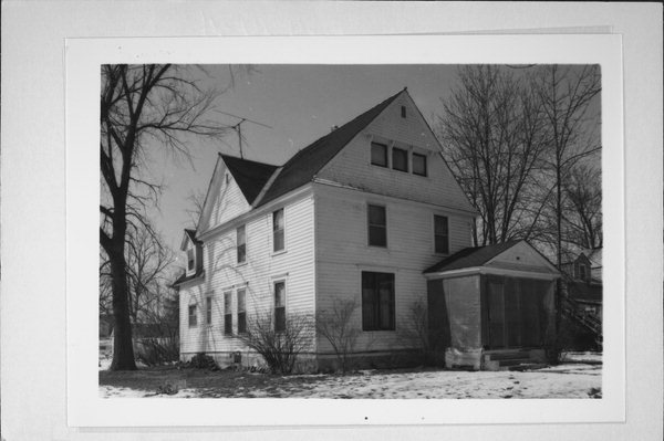 Additional Information: | This 1 1/2 story Queen Anne-style home has clapboard exterior surface material. The wide wood window frames have an entablature. There is a front 1sat story 4-pane picture window. The gable roof is pedimented and the front gable has a 3-bay window with brackets above it, wood shingles, and angular fish scales. There is a plain frieze under the eavea aand pilaster endboards. There is a side gable dormer. The stoop porch has a pedimented gable roof with geometric woodwork in it. Some of this house's integrity is lost through the front porch addition. The front gable detailing is a very nice example of stick-style work. |