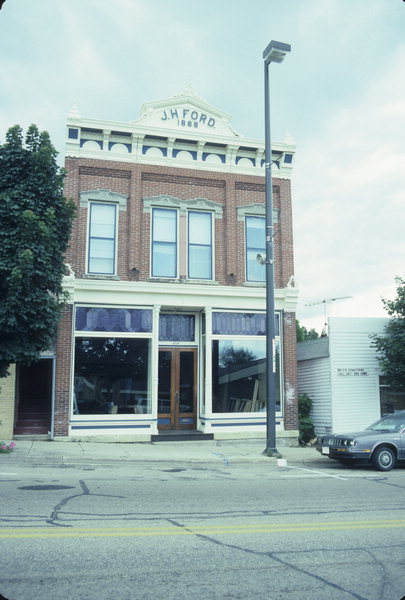 Additional Information: | This two-story commercial vernacular styled retail structure was built in 1888. (See Bib. Ref. A). It features a rectangular shaped plan configuration, a brick exterior, and a gable roof with a false front. Projecting forward on the facade is an elaborate metal cornice, complete with brackets, finials, dentil trim, and starburst motifs. The name of the building and the date of its construction is inscribed on the partial parapet, just above the cornice. Stone window hoods appear above the windows on the second story. An intact lower storefront includes cast iorn columns, which flank the front entrance, and a detailed cornice. The structure, which is a potential tax act project, is in excellent condition. Architectural/Engineering Significance: Built in 1888, the J. H. Ford building is a pivotal element of the Iowa Street Historic District. The two-story red brick block is an excellent example of commercial vernacular architecture, retaining all of its original features, both exterior and interior. Historical Background: The J. H. Ford Building has housed a hardware store since its construction in 1888. (See Bib. Ref. C). An 1890 news article described this commercial enterprise and its owner in the following manner: "J. H. Ford is an extensive dealer in hardware of all kinds, agricultural implements, etc. Mr. Ford makes a speciality of the Garland Stove and Glidden's barbed wire." (See Bib. Ref. B). |