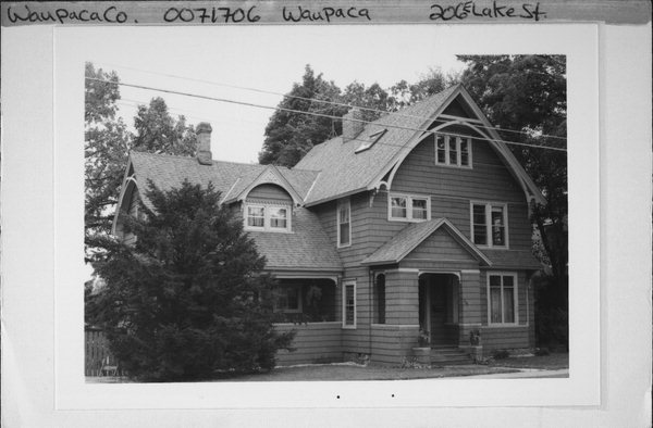 Additional Information: | The Scott house is a two and one-half story Queen Anne style house that has an irregular plan and a complex hip and gable roof. The hosue is covered with wood shingles and the gable peaks are decorated with curved bargeboard and cross pieces. Windows are largely single light sashes and there are bay projecting from the east and south elevations. These bays are covered with wood shingle overhangs. The front entrance has a gable-roofed porch with large wood-shingled piers and a wood-shingled balustrade. A side porch features similar details. The Scott house contributes to the architectural significance of the Lake Street Historic District because it is a good example of the Queen Anne style. One of the owners of the Scott house was Theodore Nelson and his wife was Edith Mix Nelson They had a daughter named Geniveve and lived in this house around 1925-1926. |