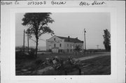 | Additional Information: | 2015- This tobacco warehouse is of frame construction, sheathed in metal panels, and rests on a raised concrete foundation. Metal sheeting covers the front gable roof, which features a stepped parapet. Two brick chimneys and two ventilation pipes project from the roof. Windows are six-over-six, double-hung, wood sash, some of which are boarded over. At the time of the survey windows in the raised basement were being replaced with undersized vinyl sliders. The front (south) facade features a loading bay with an earthen ramp and “Northern Wis. Co-Op Tobacco Pool” in the gable end. Two entry doors are located on the side (east) elevation; one is accessed by a wood ramp. Historic shed roof additions with original ground-level entry doors are located on the front and rear (north) elevations. The former CB&N railroad siding and main line are adjacent to the west elevation. In 1922, in the wake of deflated tobacco prices, Wisconsin tobacco growers organized the Northern Wisconsin Cooperative Tobacco Pool, a statewide cooperative to warehouse and sell tobacco. The cooperative operated from 1923 through 1936 at its headquarters in Viroqua and had a membership of 6,000 to 7,000. Cooperative members typically erected warehouses along railroad lines statewide to store tobacco, such as the subject warehouse in Genoa. In 1936 southern-region tobacco growers split from the cooperative while northern growers, such as those in Vernon County, continued the cooperative operations. It is unclear how long the Genoa warehouse operated." -"WSH 35, Stoddard North Village Limits to intersectiong of WIS 35 and WIS 56 in Genoa", WisDOT #5136-09-00, Prepared by Mead & Hunt, Inc., 2015. 1976- Two story, frame tobacco warehouse covered with steel corrugated siding; high basement and gable roof with false front. |