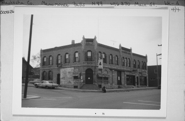 | Additional Information: | Contractor was Greisler. Original cost was $12,000. The J. Obermann Brewing Co. of Milwaukee erected this building. Besides the saloon, in 1892 and 1894 this building housed the Stolberg and Mayer Grocery, the law office of John Lunn, and a tailor shop. This building was also a meeting place for social clubs, parties and lectures. In 1910, the Jung Brewery Co. purchased the building. It then contained a saloon and a pool hall on its first floor. By 1910, a blacksmith shop and several hitching sheds also appeared behind the building. John Weber purchased and renamed the building by 1930. Harold Schramm of Menomonee Falls and Elmer Schneider of Lannon purchased the building in 1945; Weber had died in 1942. They operated the building as a tavern and restaurant and also leased spaces for offices, a barbershop, and flats. |